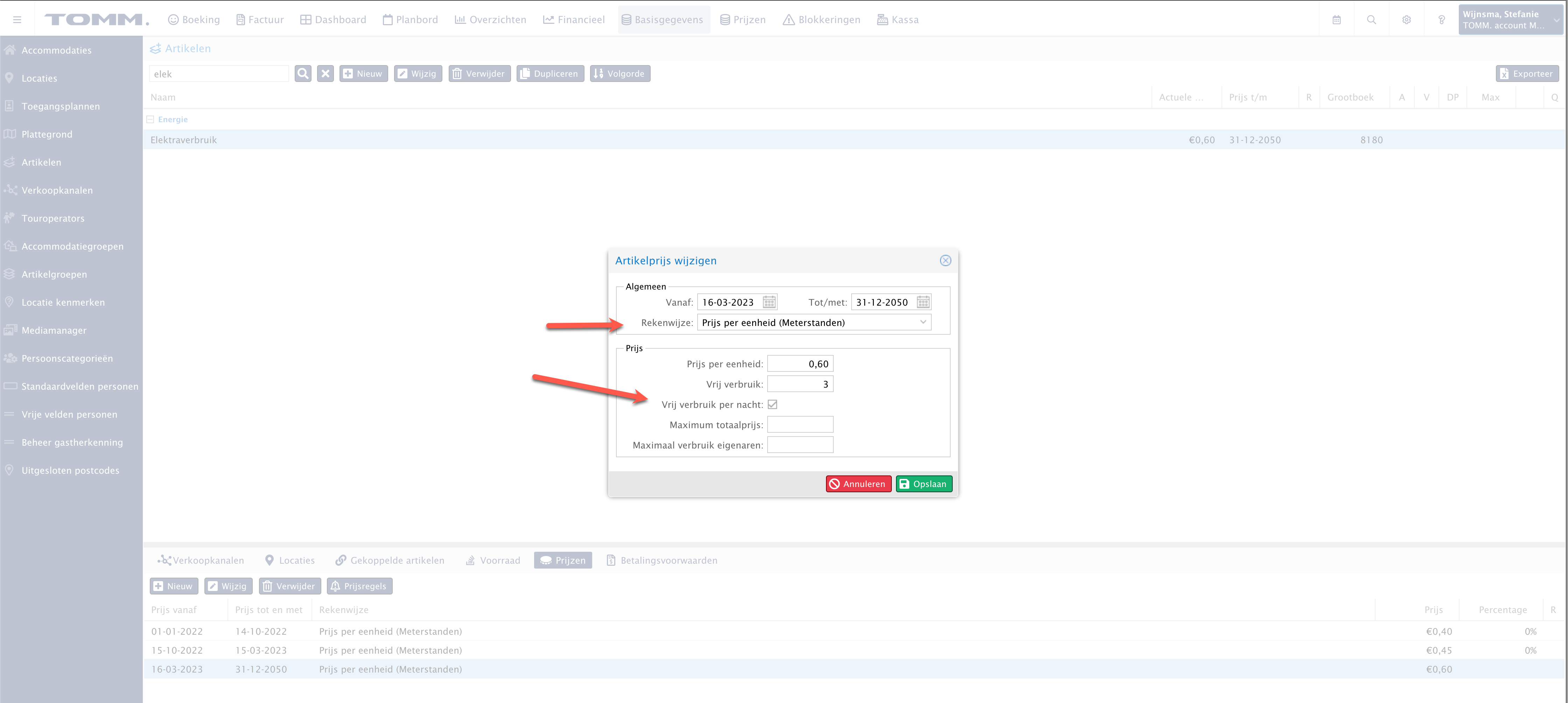 Open het artikel waar dit bij berekend wordt. Het is belangrijk dat de rekenwijze 'prijs per eenheid (meterstanden)' is. Open dan de prijsberekening en kies voor 'vrij verbruik per nacht'. In onderstaand voorbeeld is het vrij verbruik 3 per nacht.