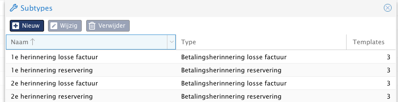 - Eigen templates en betalingsherinneringen moeten nu gegroepeerd worden in subgroepen zodat voor elke taal ook dezelfde template wordt verstuurd. Voor meer informatie, zie de handleiding over templates.